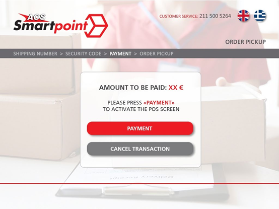 In case you have chosen the cash on delivery service, press “PAYMENT” on the relevant screen and swipe your card (Visa or Mastercard) at the POS terminal.