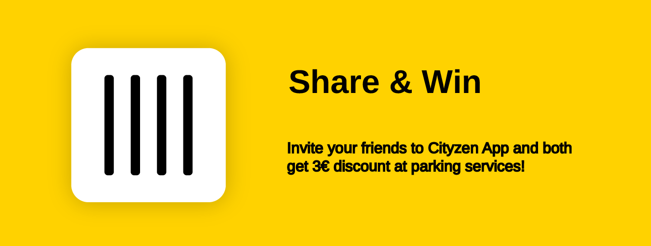 Though our new referral program Share & Win, every time you invite a friend to download Cityzen App, you and each friend, earn 3€ discount on parking. Find Share & Win in your profile!